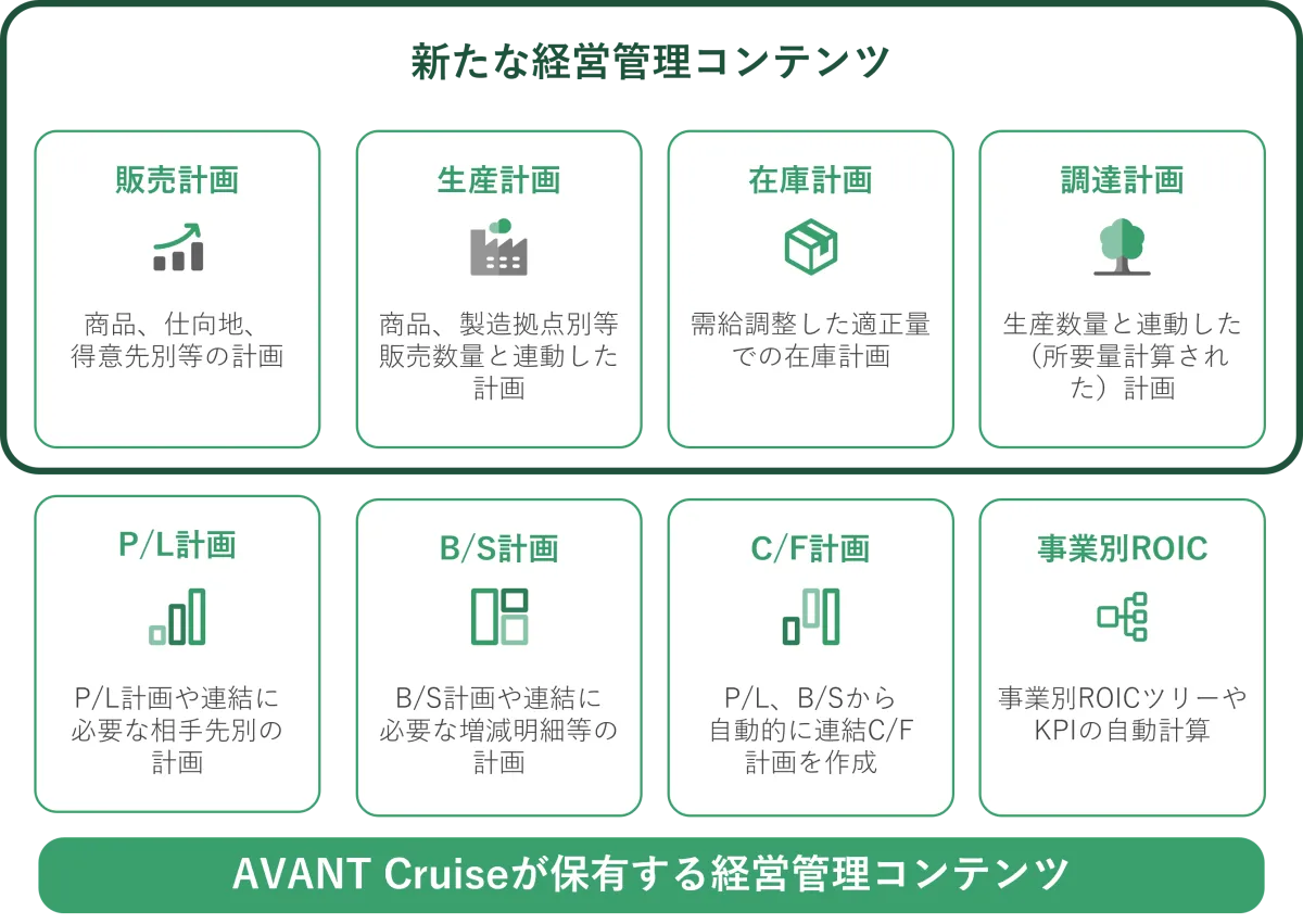 アバントでは、こうした経営ニーズに応じて、AVANT Cruiseに新たな経営管理コンテンツを開発したのです。これにより、販売、在庫、調達といった各種計画が有機的に連携し、整合性を保った戦略的な経営が行えるようになります。