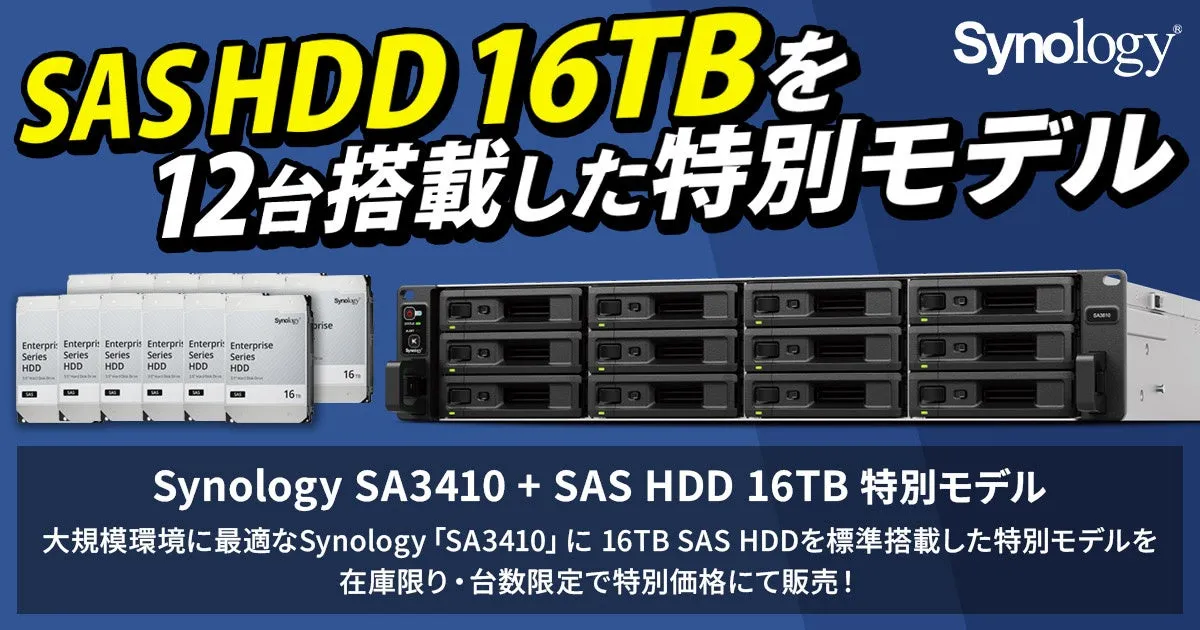 株式会社アスクが取り扱う、Synology社製のラックマウント型ストレージ「SA3410」から、特別モデルが登場しました。この限定モデルは、12台の16TB SAS HDDを標準装備しており、ミッションクリティカルなニーズを満たすための理想的な選択肢となります。