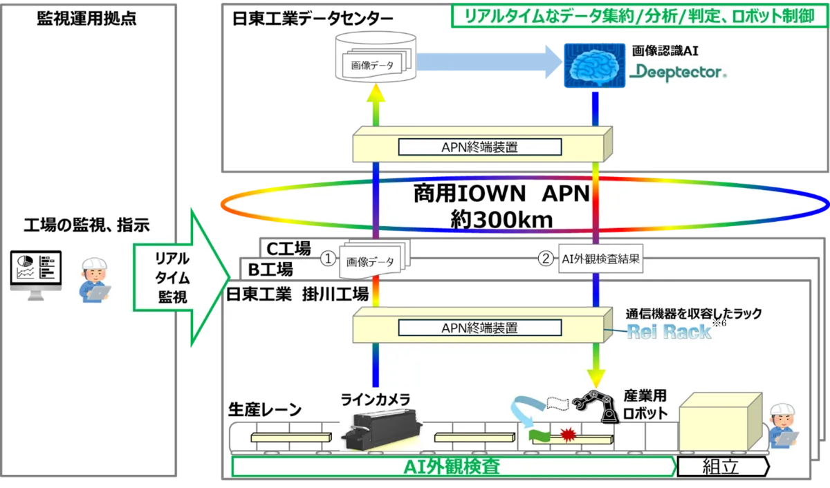 日東工業株式会社とNTT西日本株式会社、NTTドコモビジネス株式会社が共同で進めたプロジェクトが、製造業において新たな地平を切り開きつつあります。約300km離れた地点にある工場での外観検査を、最先端の画像認識AIおよびIOWN APNを用いて実施することで、効率化を図ったのです。