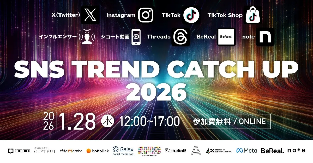 2026年のSNSマーケティングが大きく変化することが予想され、そのトレンドを探るオンラインカンファレンス「SNS TREND CATCH UP 2026」が1月28日(水)に開催されます。このカンファレンスでは、SNSに関連するさまざまな専門家が集まり、来たる2026年のマーケティングシーンについての洞察を提供します。