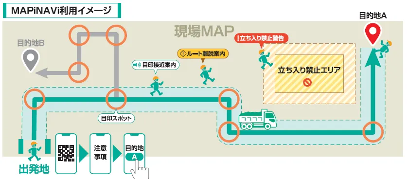 「MAPiNAVi」は、一般的なナビゲーションアプリには不向きなエリアに特化しています。建設現場や造成地、仮設道路などでスムーズに移動できるように、オリジナルマップを活用してルートを設定します。これにより、新規の作業員も迷うことなく現場に到着できる仕組みを実現しています。特に注目すべき機能が、ルート逸脱警告です。ナビゲーション中に設定ルートから外れると直ちに警告が表示され、危険区域への誤進入を防ぎます。また、特別注意事項の確認を必須化しており、作業者が安全に現場に入場するための準備ができます。