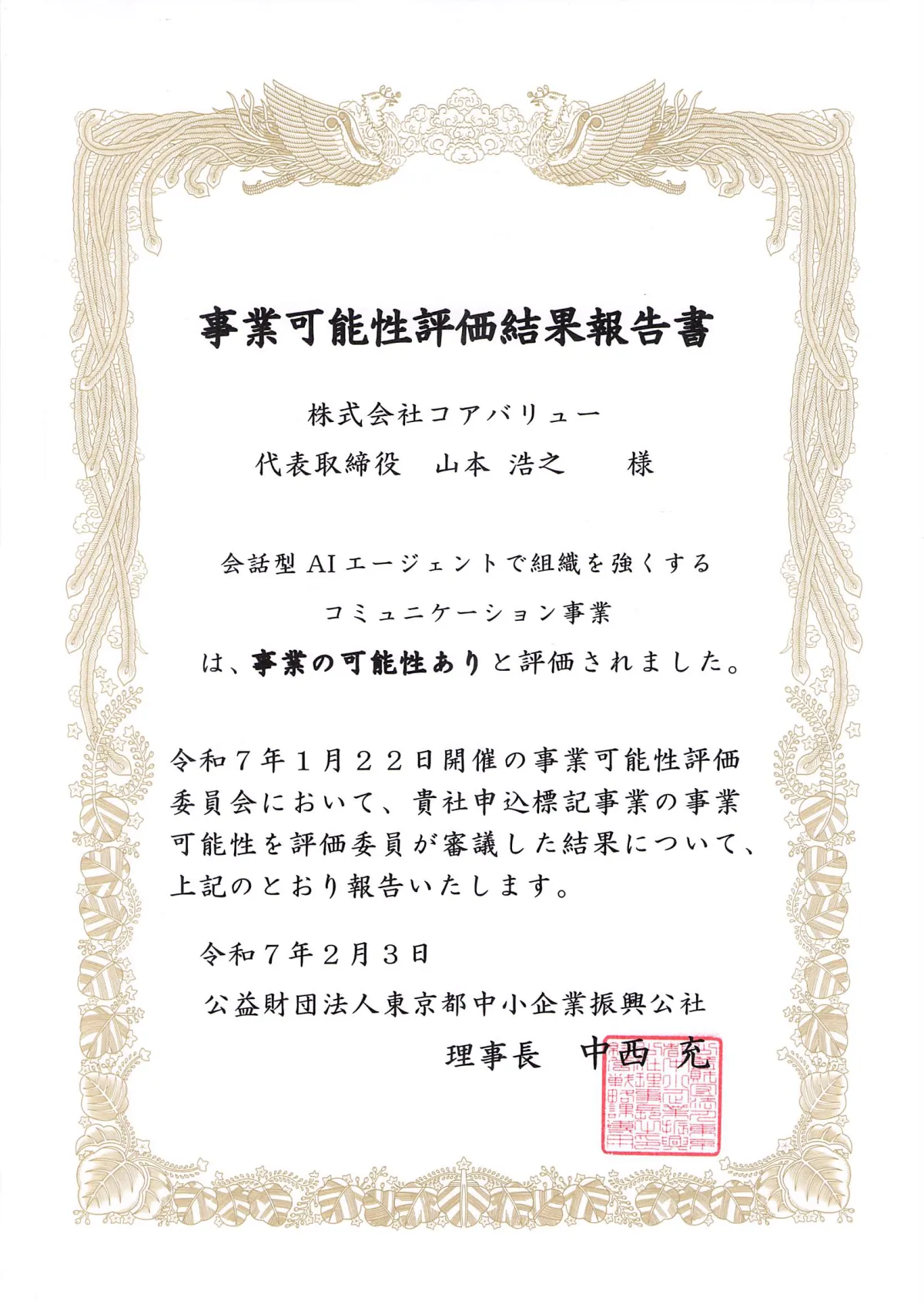 会話型AIエージェント「ValueTalk」を運営している株式会社コアバリューが、公益財団法人東京都中小企業振興公社から「事業の可能性あり」との高い評価を受けました。この評価により、コアバリューはさまざまなビジネスサポートを受けられることになり、事業の成長が期待される状況になりました。