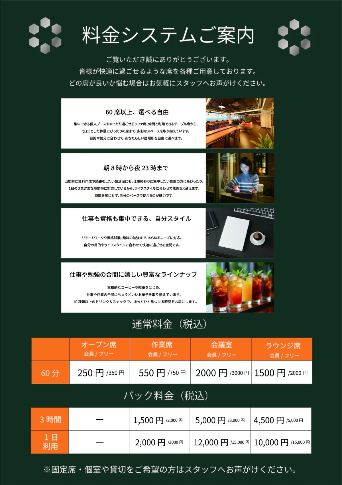 高速Wi-Fiと40種類以上の無料ドリンクやスナックが用意されており、電源も完備。利用者が快適に作業できる環境を整えています。