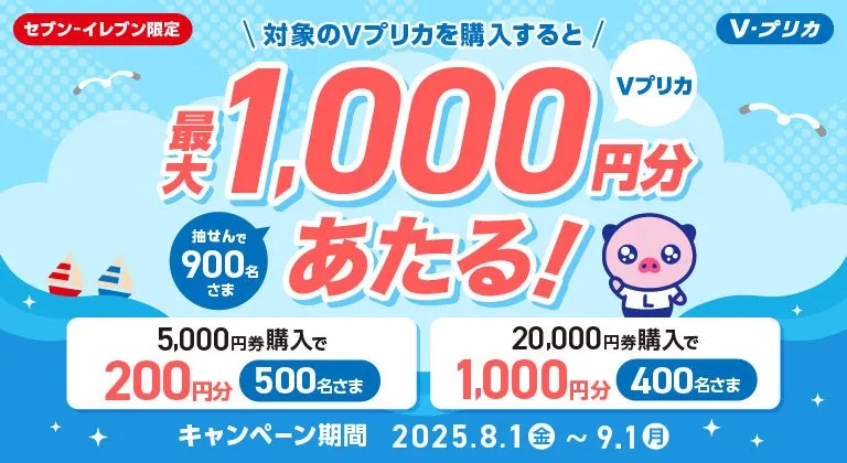 このキャンペーンに参加するには、セブン‐イレブンのマルチコピー機で対象のVプリカを購入する必要があります。購入すると、抽せんで合計900名様に最大1,000円分のVプリカが当たります。以下、キャンペーンの詳細です: