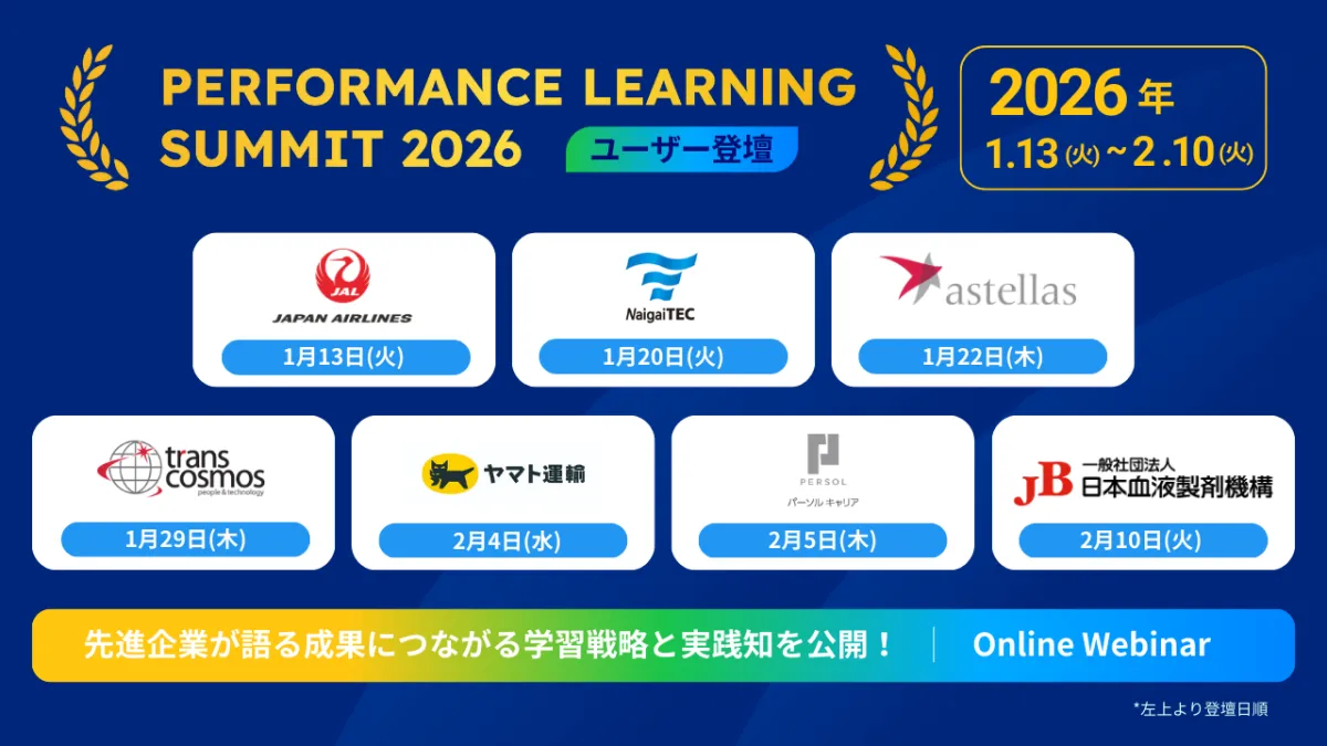 2026年1月13日から2月10日までの間、ユームテクノロジージャパン株式会社が主催する「Performance Learning Summit 2026」がオンラインで開催されます。本イベントでは、様々な業界で注目を浴びている企業が実施した学習施策を通じて、どのようにして企業業績に直結させるかの秘訣を探ります。