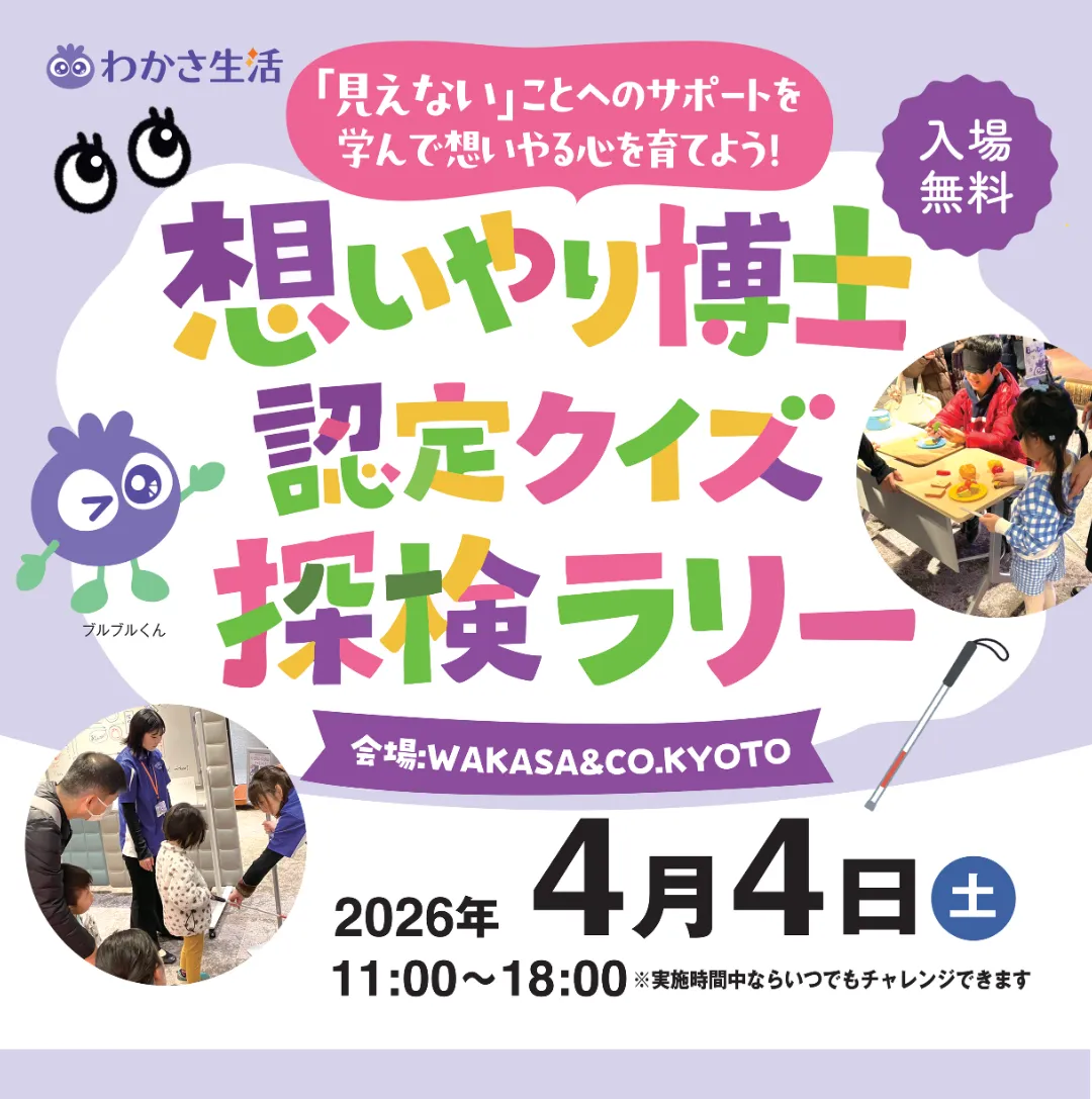 2026年4月4日(土)、京都市にある「WAKASA&CO.京都四条店」にて、視覚に関する理解を深めることを目的としたイベント「想いやり博士 認定クイズ探検ラリー」が開催されます。主催は、視覚健康に関する啓発活動を行っている株式会社わかさ生活です。このユニークなイベントは、子どもから大人まで楽しみながら“想いやりの心”を学ぶことができる貴重な機会です。