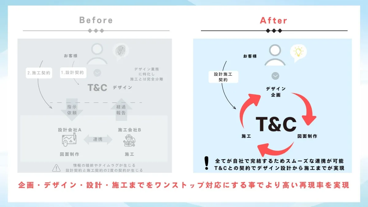 T&C JAPANは、レジデンス、商業施設、エンターテインメント空間において、その特異なデザイン力で注目を集めています。しかし、空間デザインの分野では、設計と施工が別々に行われることが多く、その結果、デザインのコンセプトや細部におけるこだわりを完全に実現するのが難しい場面がしばしば見受けられました。お客様の期待に応えるためには、デザインと施工を一体で管理する必要があると、T&C JAPANは痛感していました。