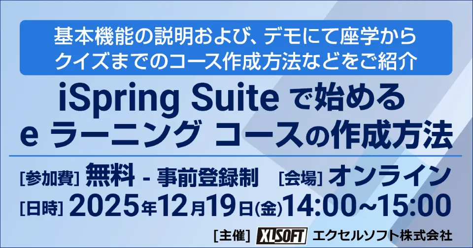 エクセルソフト株式会社では、iSpring Suiteを用いたeラーニングコース作成方法に関する無料オンラインセミナーを、2025年12月19日(金)に開催します。このセミナーは、企業や教育機関におけるeラーニング導入を検討されている方々を対象にしており、全ての参加者が簡単に参加できるようにオンラインで行われます。