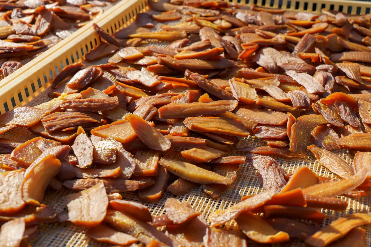 この経験を経て、芋の甘みが引き出された年の瀬に干し芋作りがスタートします。皮を剥いたさつまいもは、大釜で一晩じっくりと煮込まれ、手切りの後に天日干しされます。このように時間をかけて手間を惜しまない製法が、特徴的な黒干し芋を生むのです。