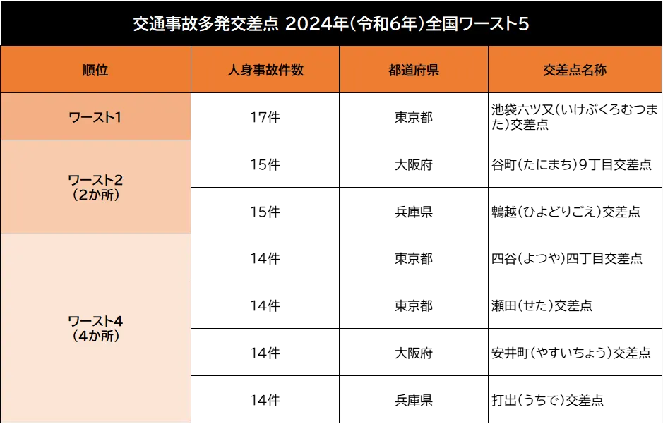 2024年の全国ワーストな交通事故多発交差点は、なんと2年連続で「池袋六ツ又交差点」となりました。この地点は、交通量が多く事故が集中するため、特に注意が必要です。この情報をもとに自治体や警察はさらなる安全対策を講じる必要があります。