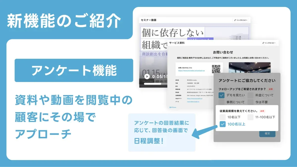 通常、資料は単なる情報源とされがちですが、この新機能により、資料が「商談を進める場所」としての役割を果たすことが可能です。閲覧中の顧客にアンケートを表示し、その回答に基づいて商談の打診を行うことができるため、企業は今まで以上に顧客の興味を引きつけることが出来るのです。