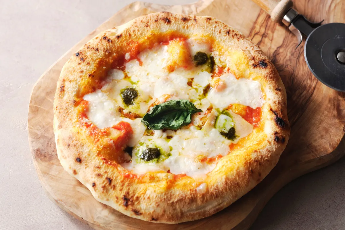 水牛と乳牛のモッツァレラチーズを贅沢に使用したバジルが香るマルゲリータピザ。ナポリの伝統製法で薪窯で焼き上げています。