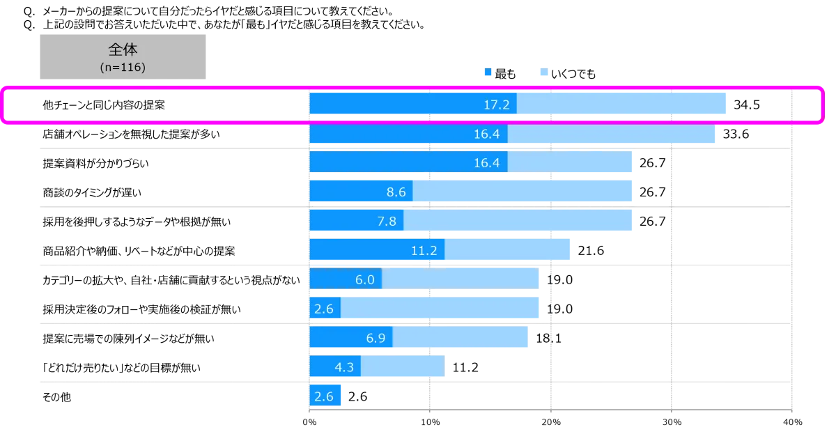市場が不透明になる中で、同じカテゴリー内でも業績に差が生じており、小売業は「他社との差別化が可能な提案」をこれまで以上に重視しています。汎用的な販促策に関しては、これまでと同様に受け入れられにくくなっており、メーカーは独自性のある施策を提案する必要があります。特に、「他チェーンと同じ内容の提案」が最も嫌われる傾向にあり、34.5%の人がイヤだと感じています。これによりメーカーには、クリエイティブなアイデアと市場を見据えた独自の提案が求められています。