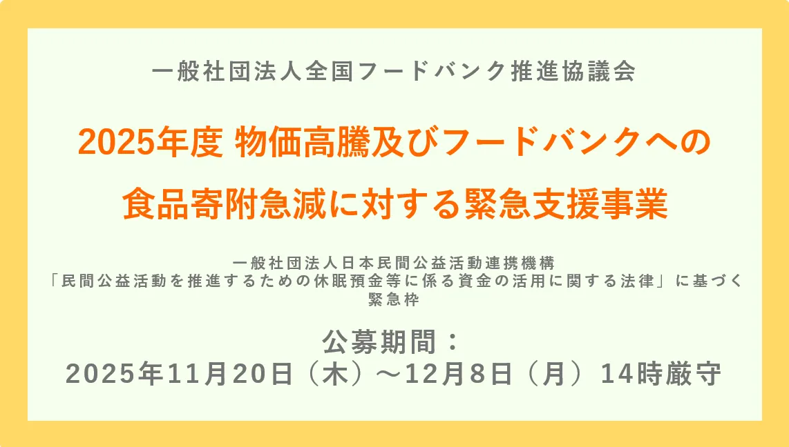 この緊急支援事業に参加する団体は、フードバンクや子ども食堂、フードパントリーなど食料支援を行う団体で、全国で7団体の選定を予定しています。各団体には上限1,200万円の助成金が交付され、総額で8,400万円の支援が実施される見込みです。助成期間は2026年3月から2027年2月末までを予定しています。