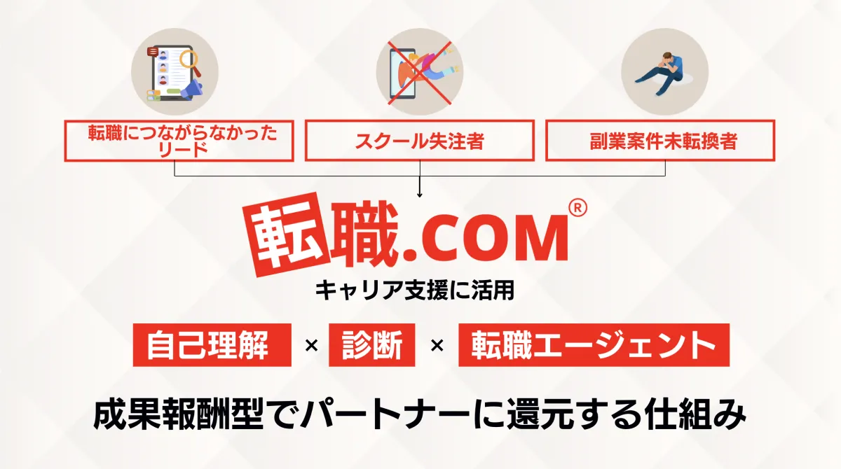 今まで、多くのtoC向け商材やスクールビジネスでは、成約に至らなかったユーザーを「失注」として扱い、その後のフォローを行わないことが一般的でした。しかし、実際にはこのような決断に至らなかった方々こそが、本当に支援を必要としています。例えば、お金や時間の理由で申込みを躊躇した方や、慎重に検討した結果、決断を先送りにしてしまった方たちです。これらの方々を支援することを目的としたのが「転職.com」です。