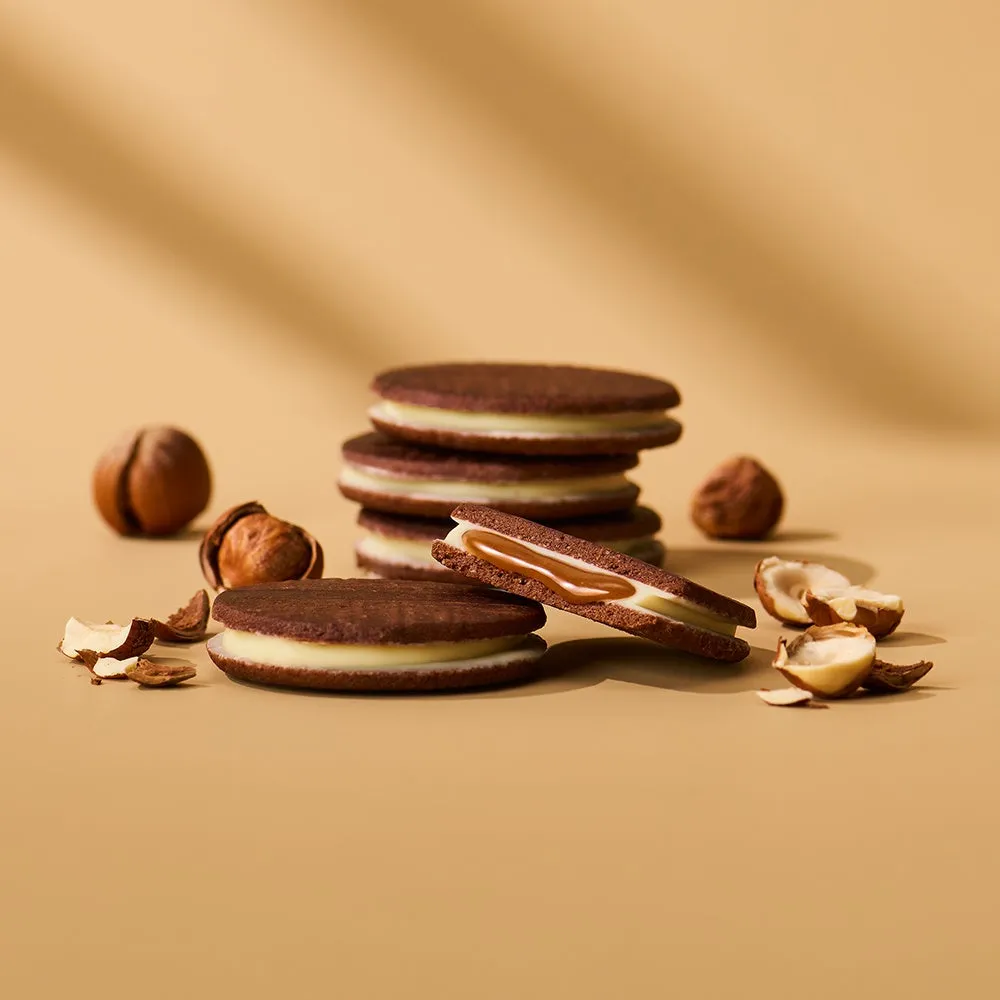 新たに登場する「N.Y.ヘーゼルナッツカカオキャラメルサンド」は、ローストしたヘーゼルナッツの香ばしさと、濃厚な味わいが特徴のとろけるキャラメルが魅力です。それをホワイトチョコレートで包み込んだこの商品は、カカオの深い香りを引き立てる繊細なココアクッキーでサンドされています。ここで重要なのは、クッキーのほろ苦さとホワイトチョコレート、キャラメルの甘さの絶妙なバランスです。食べた瞬間、口の中でさまざまな食感が交わり、顔がほころぶこと間違いなしです。