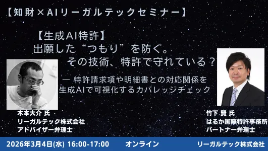 リーガルテック株式会社が主催する「知財×AIリーガルテックセミナー(第25回)」が、2026年3月4日(水)にオンラインで開催されます。このセミナーでは、実務の最前線に立つ2名の弁理士が、特許請求項と技術内容の関係について詳しく解説します。