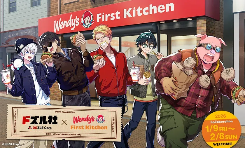 ウェンディーズ・ジャパン株式会社とファーストキッチン株式会社は、2026年1月9日(金)からゲーム実況グループ『ドズル社』とのコラボレーションキャンペーンを始める。このキャンペーンでは、ドズル社をイメージした「マイルドカレー味」ポテトが数量限定で販売されるだけでなく、オリジナル描き下ろしイラストを使用したステッカー付きセットも販売される。価格は780円(税込)。販売期間は2026年1月9日(金)から2月8日(日)までで、特定の店舗でのみ購入可能だ。