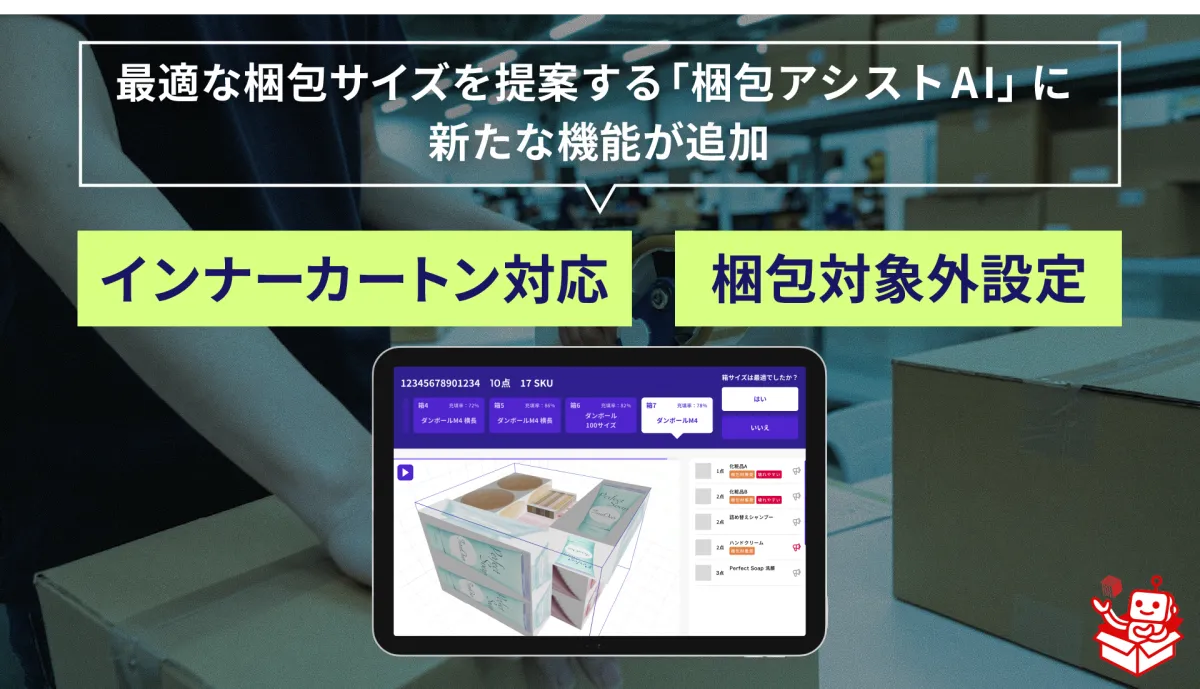 株式会社ROMS(本社:東京都品川区)は、物流現場での梱包業務を効率化するために、最適な梱包サイズを提案する『梱包アシストAI』に新たな機能を追加しました。このアップデートには、「インナーカートン(内箱)対応」と「梱包対象外設定」の2つの重要な機能が含まれています。