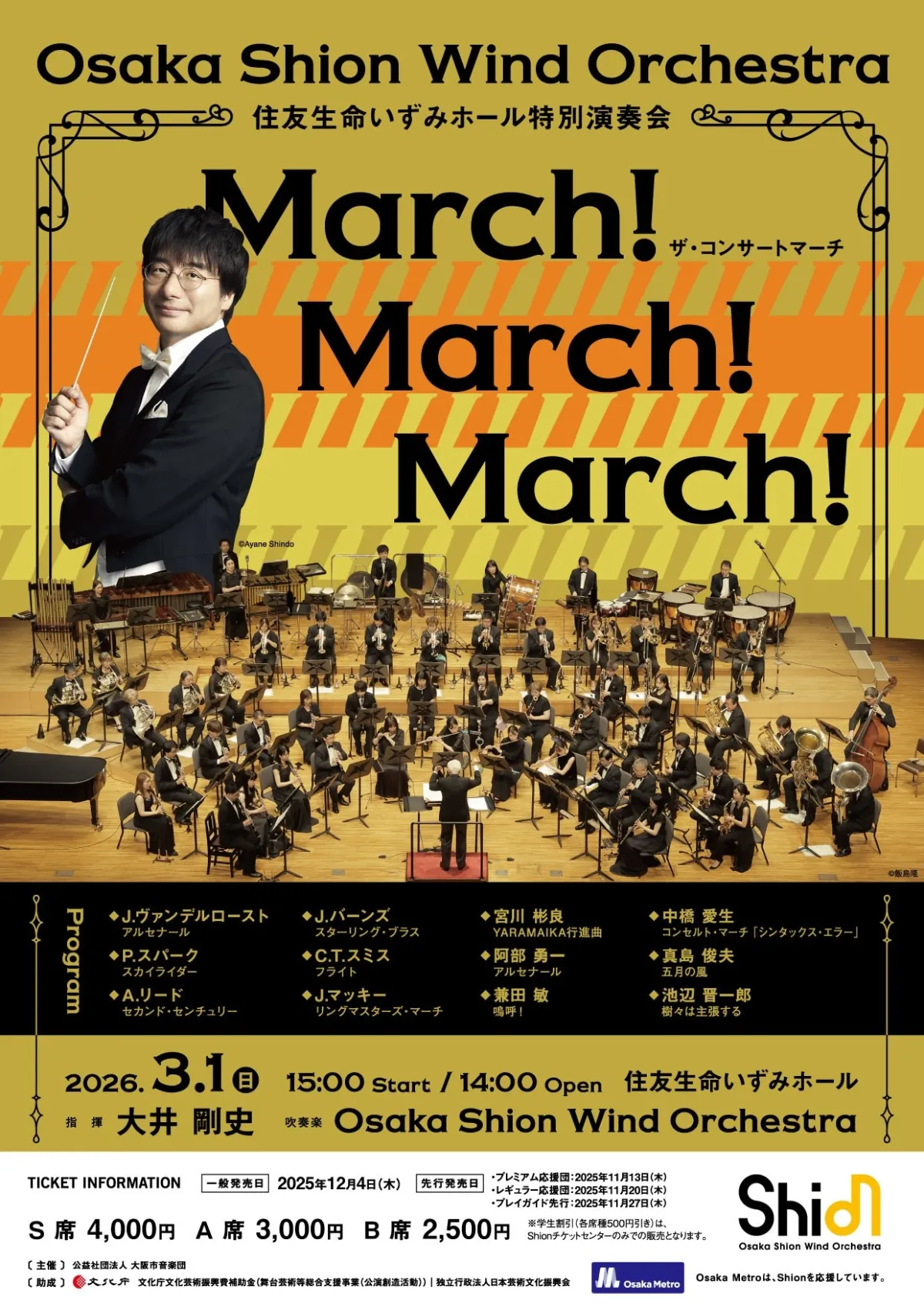 2026年の春、大阪市中央区に位置する住友生命いずみホールで、春の訪れを感じる素晴らしい音楽イベント「住友生命いずみホール特別演奏会 MARCH! MARCH! MARCH!」が開催されます。今年で7回目を迎えるこの演奏会は、日本で最も長い歴史を持つ交響吹奏楽団、Osaka Shion Wind Orchestraが演奏を担い、指揮には著名な指揮者・大井剛史が登場します。