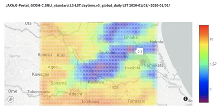 回答: 「約12.8度で、GCOM-C衛星によってキャプチャされたデータに基づいています。」