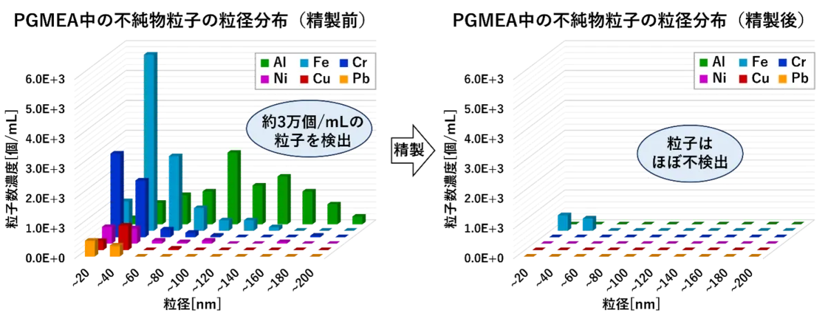 TRCが分析を行った例として、プロピレングリコールモノメチルエーテルアセテート(PGMEA)が挙げられます。この溶剤は半導体製造の過程で広く使われており、試験の結果、一般に「高純度」とされるPGMEAでも複数の金属ナノ粒子が存在することが確認されました。これは、薬液の純度をさらに高める必要性を示す重要な結果です。