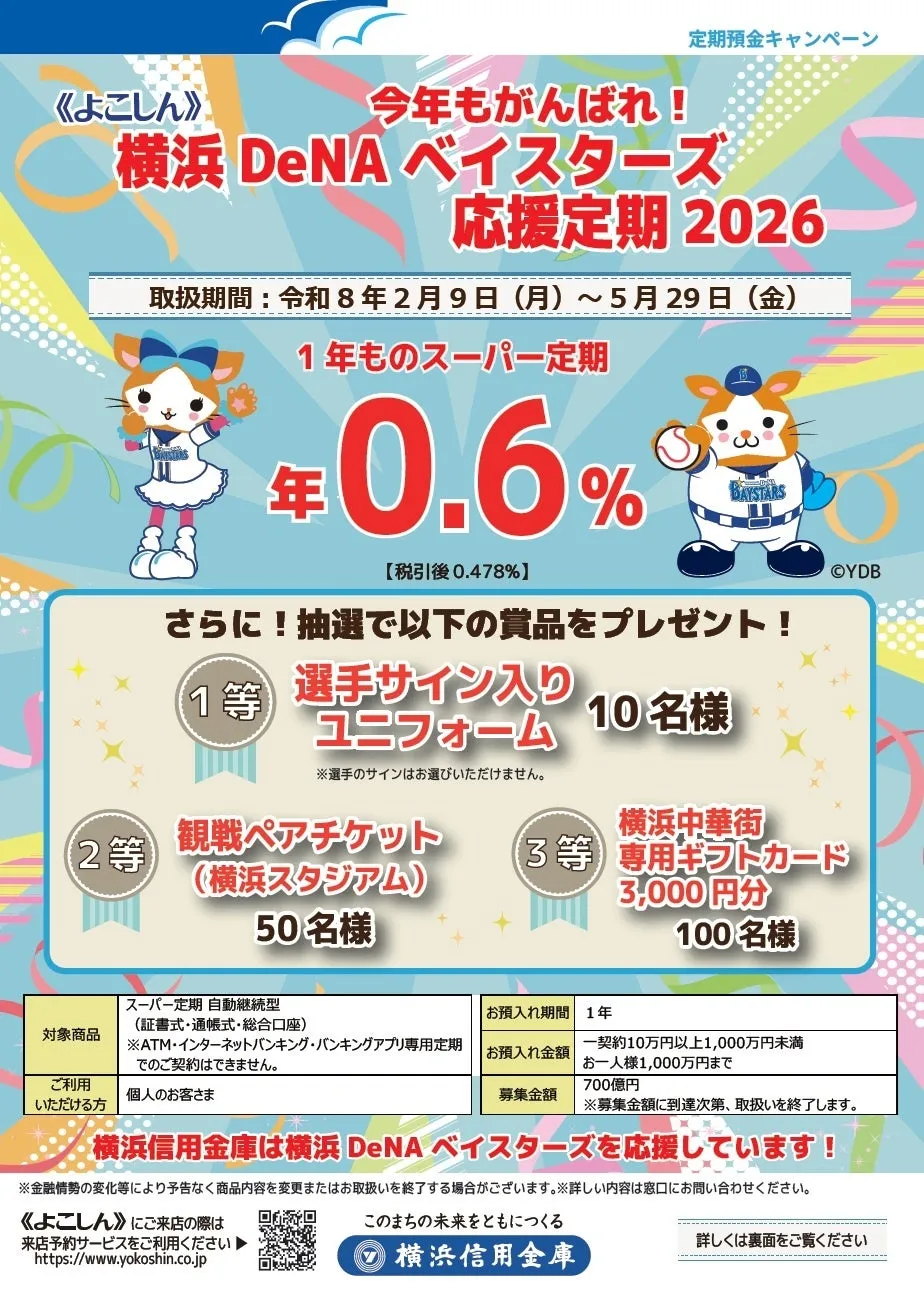 横浜市中区に本拠を置く横浜信用金庫が、2026年も地域の皆様と共に横浜DeNAベイスターズを応援するため、新たに「《よこしん》横浜DeNAベイスターズ応援定期2026」の取扱いを開始します。この企画は、地域金融機関としての責任を果たし、スポーツの振興を目的としています。
