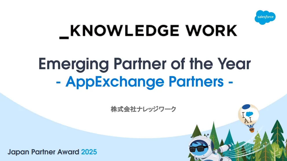 株式会社ナレッジワーク(本社:東京都港区、CEO 麻野耕司)は、2025年のSalesforce Japan Partner Awardにて「Emerging Partner of the Year - AppExchange Partners -」を受賞しました。この栄冠は、ナレッジワークが掲げる「できる喜びが巡る日々を届ける」というミッションが、テクノロジーの発展と共に進化し続けていることを象徴しています。