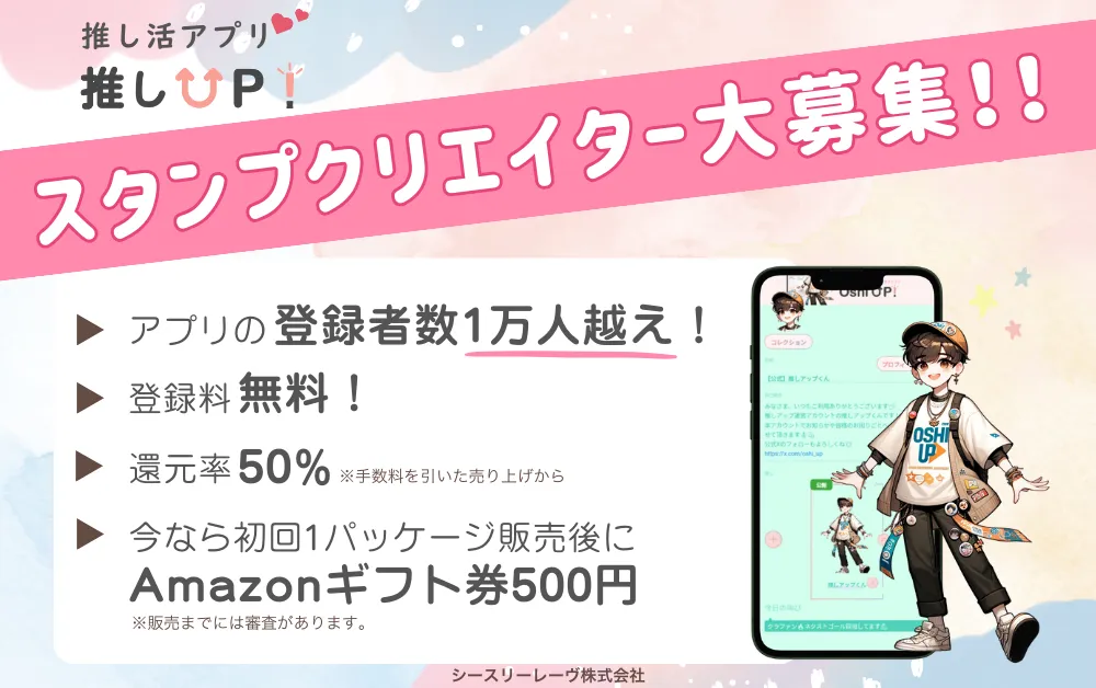 新機能の導入に伴い、スタンプイラストを描くクリエイターを募集しています。応募は簡単で、イラストを送るだけで参加可能。面倒な登録や販売手続きは全てシースリーレーヴにお任せ。参加は無料で、スタンプ売上の50%が還元されるなど魅力的な条件が揃っています。