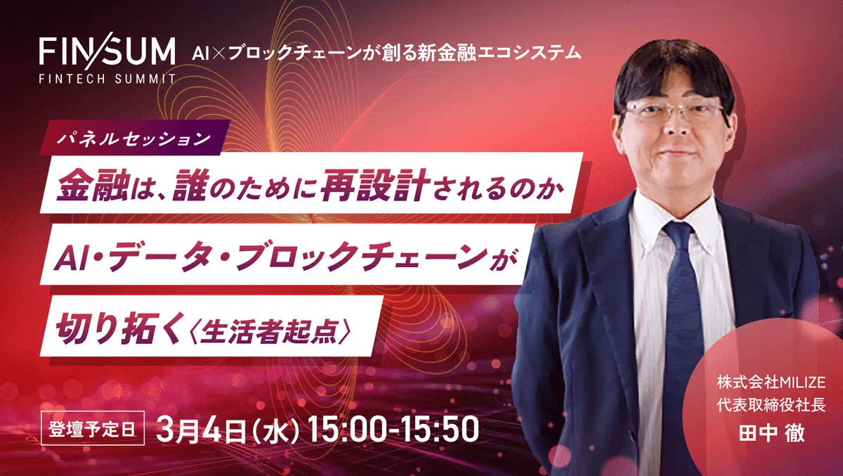 2026年3月に東京で開催される「FIN/SUM NEXT ー AI×ブロックチェーンが創る新金融エコシステム」において、株式会社MILIZEの代表取締役社長である田中徹氏がパネルセッションに登壇することが発表されました。