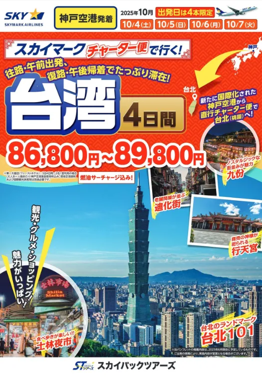スカイパックツアーズ株式会社は、神戸空港発着の新たな旅行商品「スカイステイション台湾4日間」の予約受付を開始しました。このパンフレット旅行商品では、スカイマークのチャーター便を利用して、台湾の台北(桃園)を魅力的な4日間の旅先として提案しています。2025年10月4日から7日までの出発に限定されたこのプランの特徴や魅力を詳しく解説します。