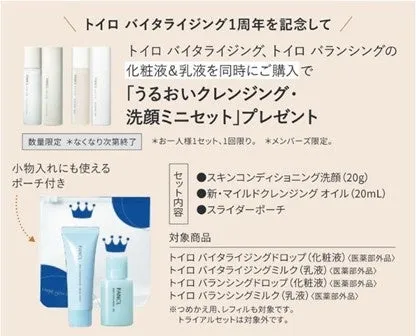 直営店舗にて、「トイロ バイタライジング」と「トイロ バランシング」の化粧液と乳液を同時購入すると、うるおいクレンジング・洗顔ミニセットをプレゼント。旅行や外出の際に便利なサイズ感で、収納用ポーチ付きです。数量限定なので、欲しい方はお早めに。