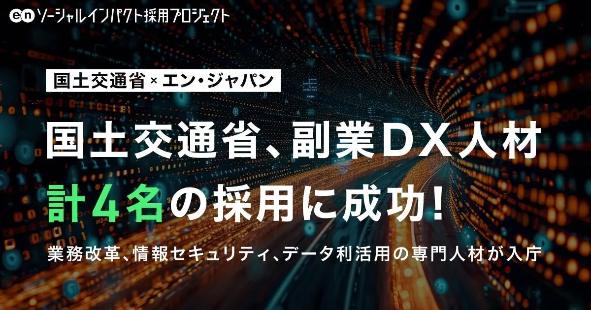 国土交通省は、エン・ジャパン株式会社と連携し、DX推進人材の採用を成功させました。2024年2月に実施された『ソーシャルインパクト採用プロジェクト』では、業務改革、情報セキュリティ、データ利活用など、デジタル改革を推進する専門性の高い4名が新たに国土交通省に入庁しました。