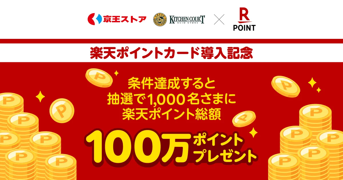 今回の楽天ポイントカード導入を記念して、2026年2月4日から3月31日まで、「京王ストア 条件達成で抽選で1,000名様に楽天ポイントプレゼントキャンペーン」を実施します。このキャンペーンでは、298円(税抜)以上の支払い時に楽天ポイントカードを提示した方の中から抽選で1,000名に、1,000ポイントの楽天ポイントがプレゼントされます。