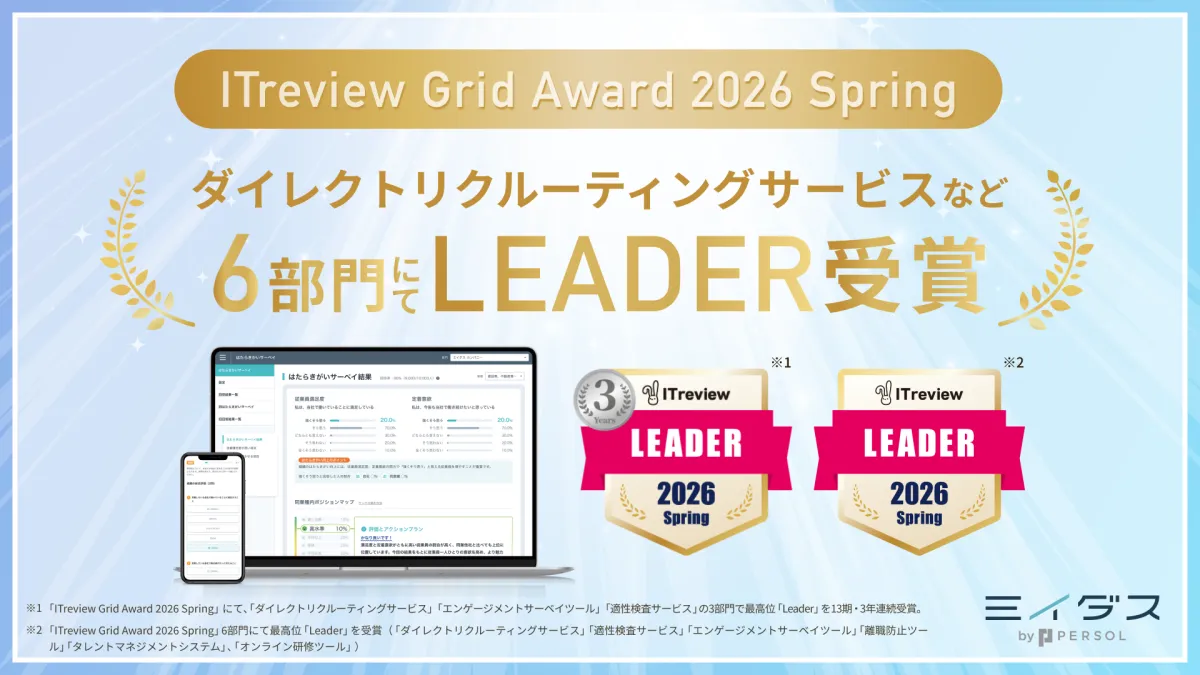 この賞は、ITレビューに投稿されたユーザーの評価をもとに、四半期ごとに優れた製品を表彰します。2026年の春の授賞式では、顧客満足度と認知度が非常に高い製品が「Leader」として選ばれ、バッジが授与されます。今回は『ミイダス』が4年連続で、ダイレクトリクルーティングサービス、適性検査サービス、エンゲージメントサーベイツールの3部門で最高位を獲得しました。また、離職防止ツールも7期連続、タレントマネジメントシステムは6期連続で受賞しています。
