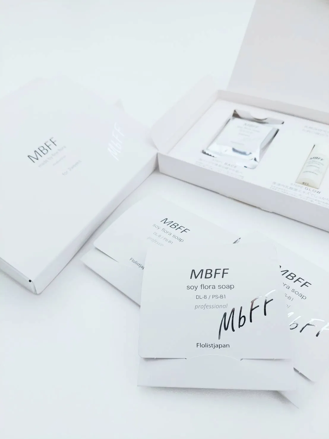 MBFFソイフローラソープ。このソープはエタノールフリーで、肌に優しい成分のみを使用しています。細かな泡立ちとしっとりとした洗い上がりが特徴で、洗浄効果と高い保湿力を両立しています。これにより、洗顔後も肌が潤いを保ち、健やかさをキープします。