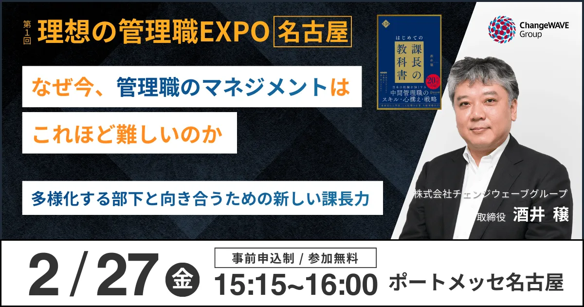 2026年2月27日、名古屋のポートメッセにて「第1回 理想の管理職EXPO 名古屋」が開催されます。このイベントは、変化の激しい現代において求められる管理職の新たな役割やスキルに焦点を当て、経営層や人事部門、管理職向けの展示会です。