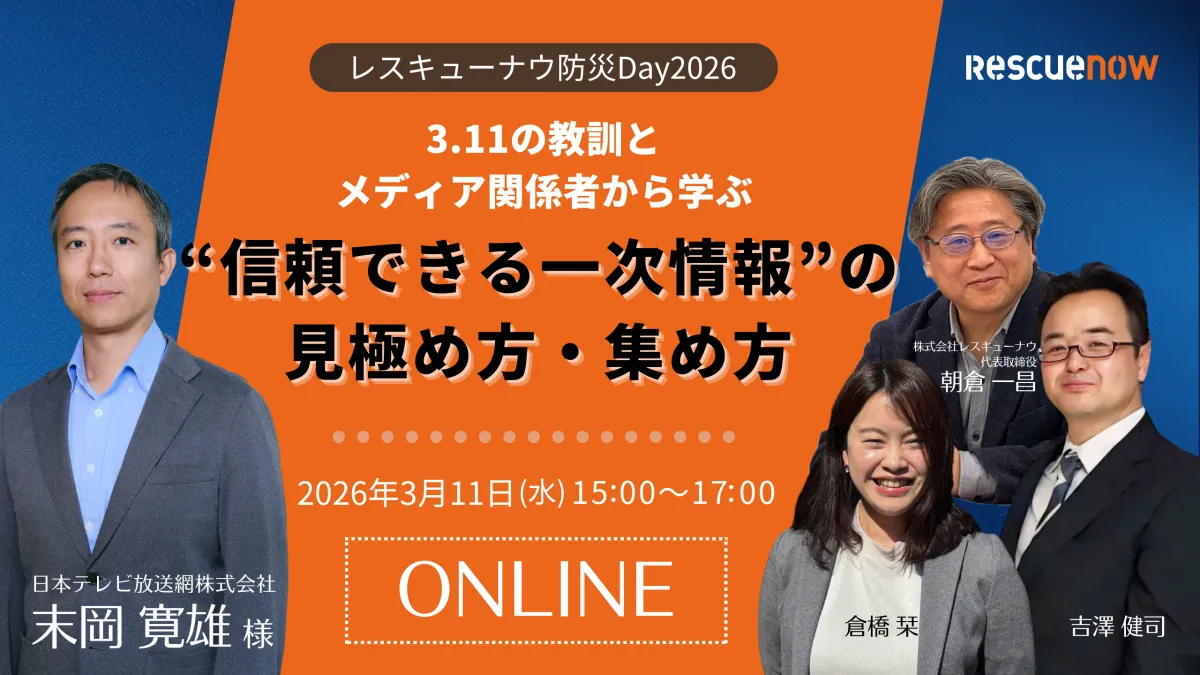 当日は、日本テレビ放送網株式会社の末岡寛雄様をゲストに迎え、メディアの立場から災害情報の受け取り方やその重要性についてお話しいただきます。一方で、レスキューナウからは、危機管理情報部の吉澤健司や営業部の倉橋栞が、現在の災害情報の取り扱いや、企業が知っておくべき「情報の裏取り技術」、さらにはリソース不足を解消するための「情報収集の自動化」についても詳しく解説します。