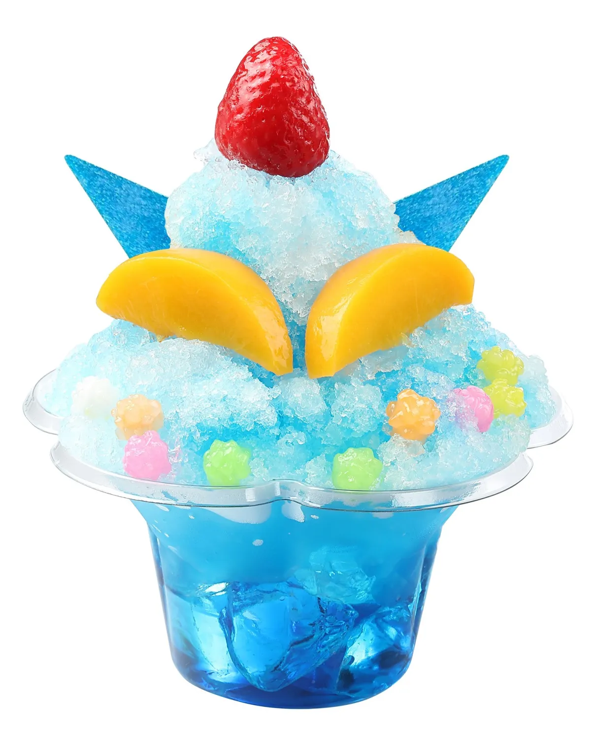 今回のかき氷のメニューは、見た目にも楽しいスイーツが3種類。まずは「アクション仮面 かき氷」。このかき氷は、爽やかなブルーハワイのシロップで作られており、フルーツがぎっしりとトッピングされています。思わず写真を撮りたくなるような彩り豊かなビジュアルです。