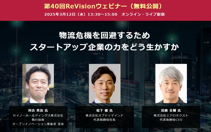 2024年3月12日(水)、次世代の物流課題を解決するための重要なWEBセミナーが開催されます。このセミナーのテーマは「物流危機を回避するため、スタートアップ企業の力をどう生かすか」です。これは、ReVision Auto&Mobilityが主催し、業界のリーダーたちから直接最新の情報を得る機会として位置付けられています。