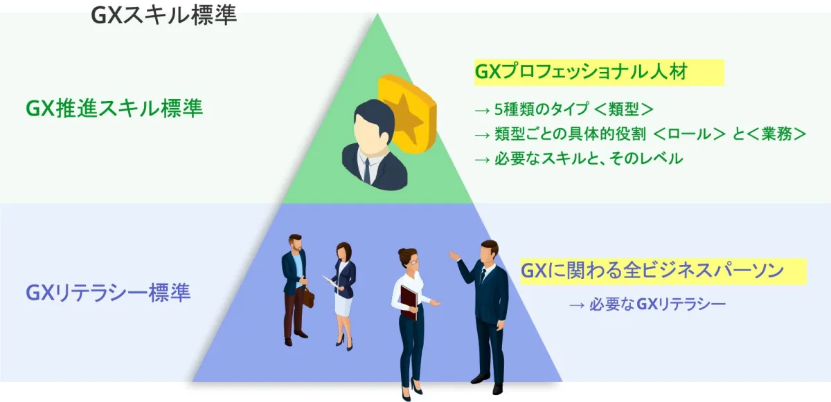 新たに策定された「GXスキル標準 ver2」では、脱炭素関連の企業プロジェクトを推進するための人材とそのスキルセットが示されています。GXスキル標準には、以下の二つの主要な要素が含まれています。