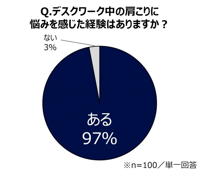 デスクワーカーの97%が肩こりを感じた経験があるという調査結果が明らかになりました。これだけ多くの人が肩こりに悩まされているということは、デスクワークを行う環境において肩こりが思わぬストレスの原因になっていることを示唆しています。
