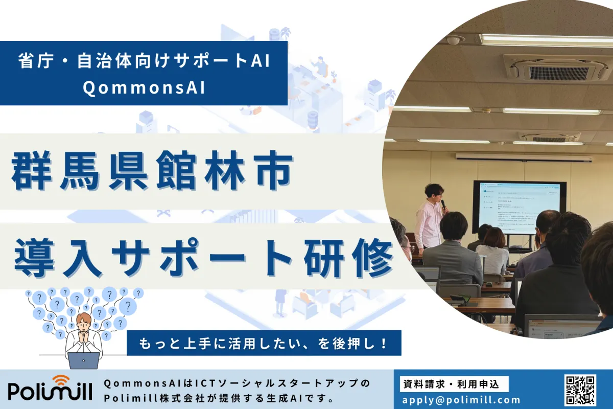 2025年1月29日、群馬県館林市において、AIを社会に浸透させる役割を果たすICTソーシャルスタートアップ、Polimill株式会社が主催する「QommonsAI」の導入サポート研修および個別相談会が行われました。今回の研修には、館林市の職員が参加し、AI技術の応用力を高める内容となっています。