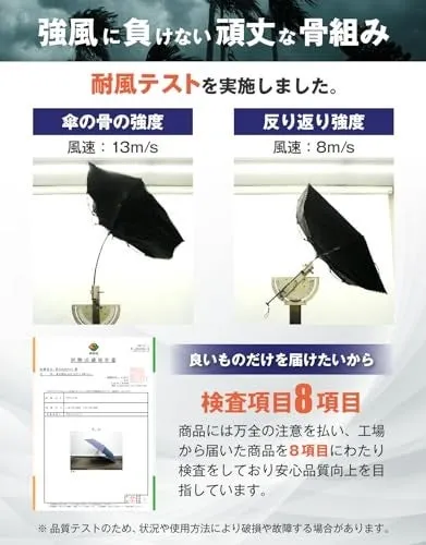 この傘は、カーボンファイバー製の骨組みによって作られています。専門機関での耐風テストでは、風速13m/sまで耐えることが確認されており、強度は抜群。万全の品質管理が施されており、工場出荷時に8項目を超える検査を行っています。これにより、安心して日常的に利用できる製品となっています。