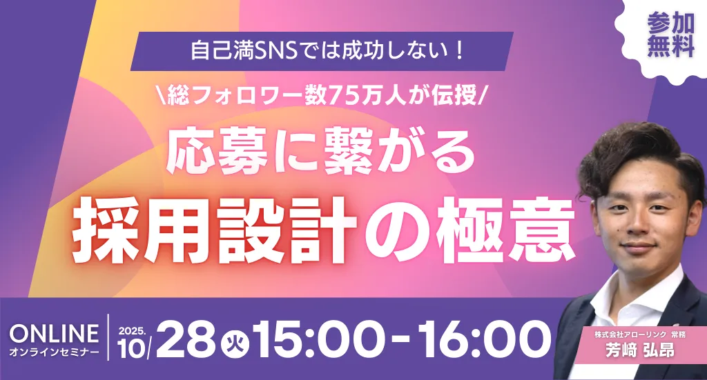 最近、SNSを使った採用活動が注目を集めています。特に新卒採用においては、SNSが企業と求職者をつなぐ重要なツールとなっています。しかし、単に投稿するだけでは意味がありません。ここでは、総フォロワー数75万人を誇る株式会社アローリンクの芳﨑弘昂が、成功するための具体的な「採用設計」のノウハウをお伝えします。