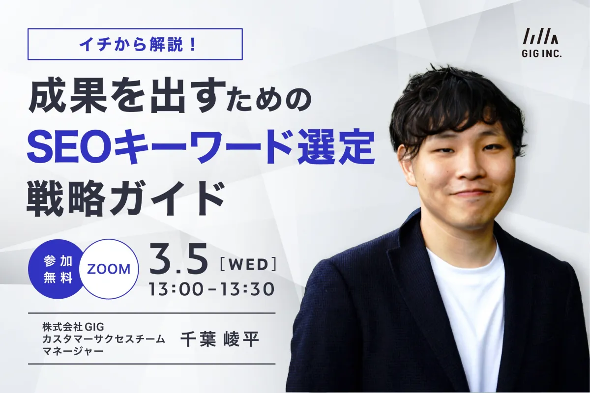 今回のウェビナーには、千葉崚平氏が登壇します。彼は株式会社GIGのカスタマーサクセスチームのマネージャーとして、豊富なマーケティング経験を持ち寄ります。広告代理店での企画営業を経てフリーランスのマーケターとして独立し、業界内で数多くの実績を上げてきました。SEO対策に関しても相当な知見を有しており、参加者にとって有益な情報を提供することが期待されます。