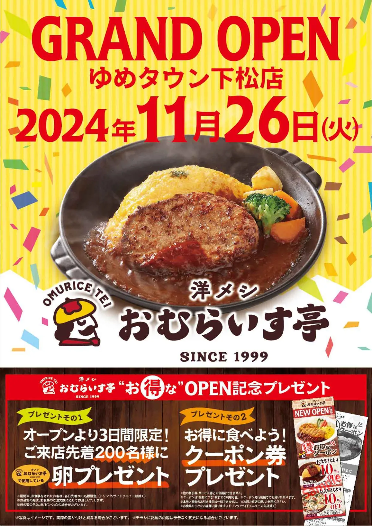 11月26日(火)、山口県下松市に「おむらいす亭」がついにグランドオープンします。西日本を中心に32店舗展開しているこのオムライス専門店は、山口県内では5店舗目となる新たな食の拠点です。オープンを記念して、来店先着200名には特製卵とクーポンのプレゼントも用意されています。