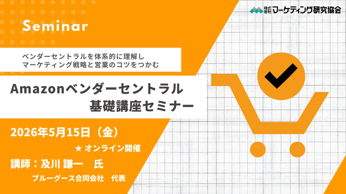 5月15日に開催されるオンラインセミナー「アマゾンベンダーセントラル基礎講座」は、アマゾンでの売上拡大を目指す家具や雑貨などのノーブランドメーカーブランドが直面する多くの課題を解決するために設計されています。特に、ベンダーセントラル特有の悩みを抱える企業にとって、体系的に学べる貴重な機会です。\