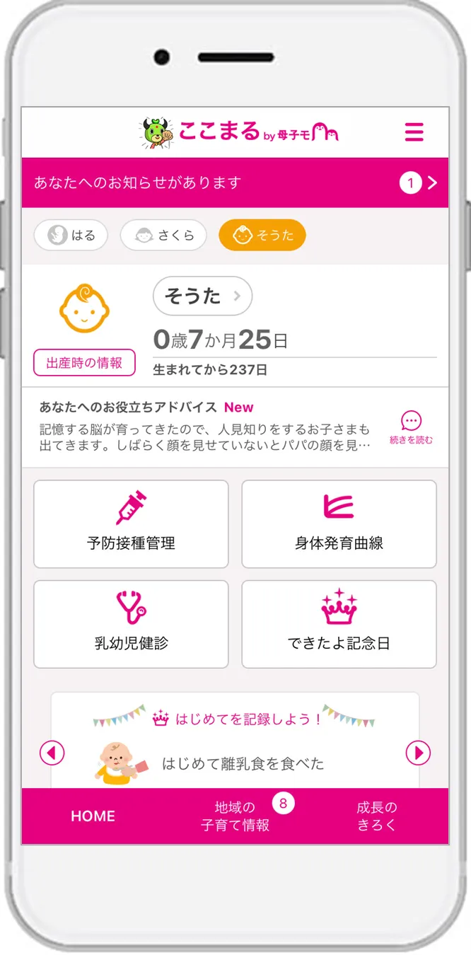 『ここまる』のアプリは、育児日記機能「できたよ記念日」を用意しており、子どもが成長する過程を写真やメッセージで記録できます。さらに、自治体からの情報配信や、妊娠や育児に関するアドバイスも提供。急な社会的変化に Bezugされた注意情報や保健師からのアドバイスがテキストや動画で届けられるため、非常時でも安心して育児が行えます。
