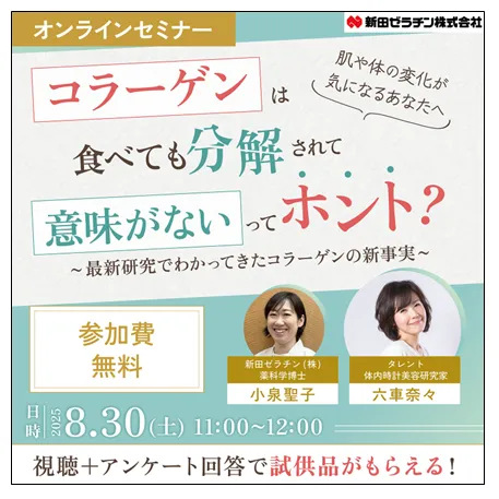 新田ゼラチン株式会社が主催する無料オンラインセミナーが開催されます。このセミナーでは、コラーゲンに関する素朴な疑問や最新の研究結果が紹介され、コラーゲンの体内での働きについて深く学ぶことができます。